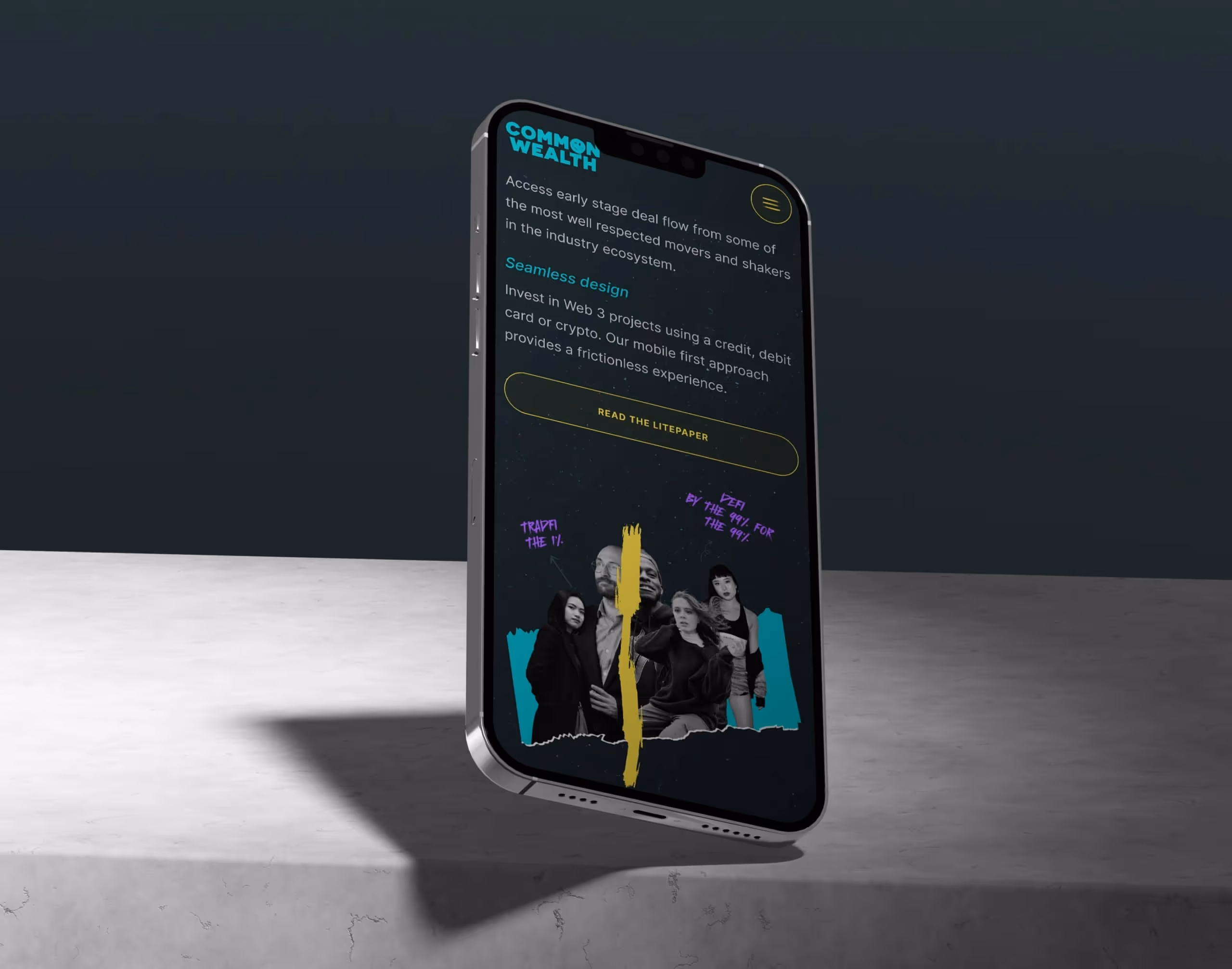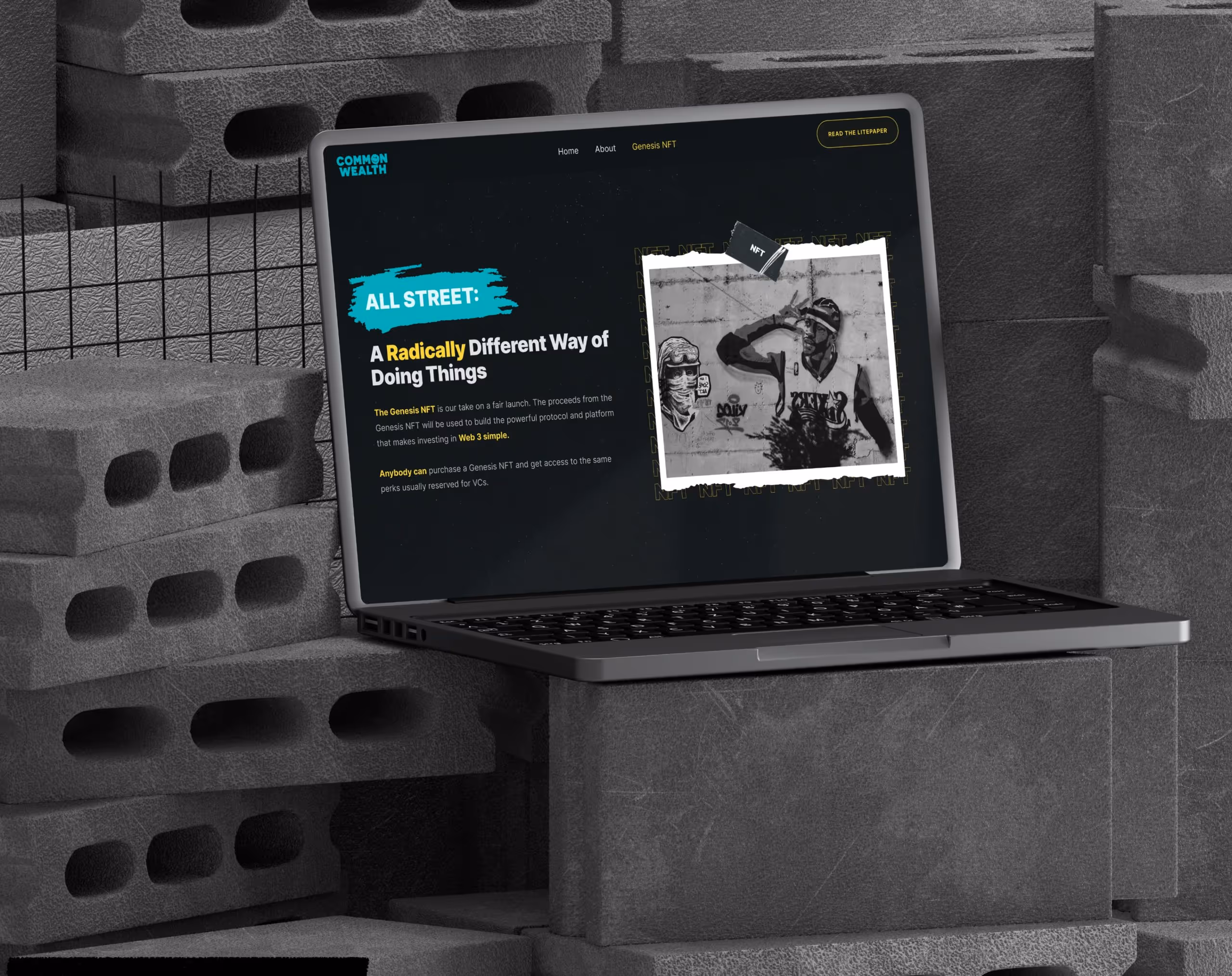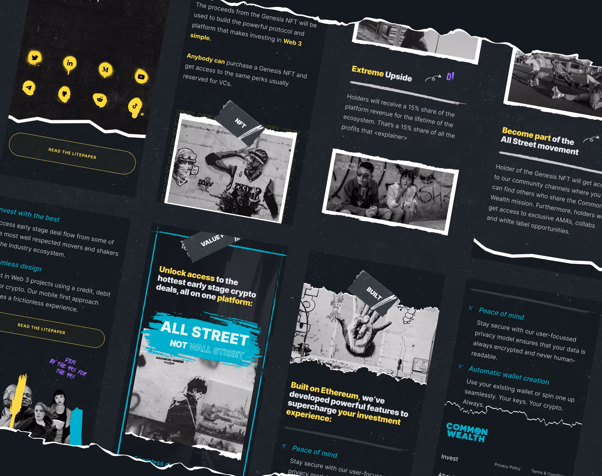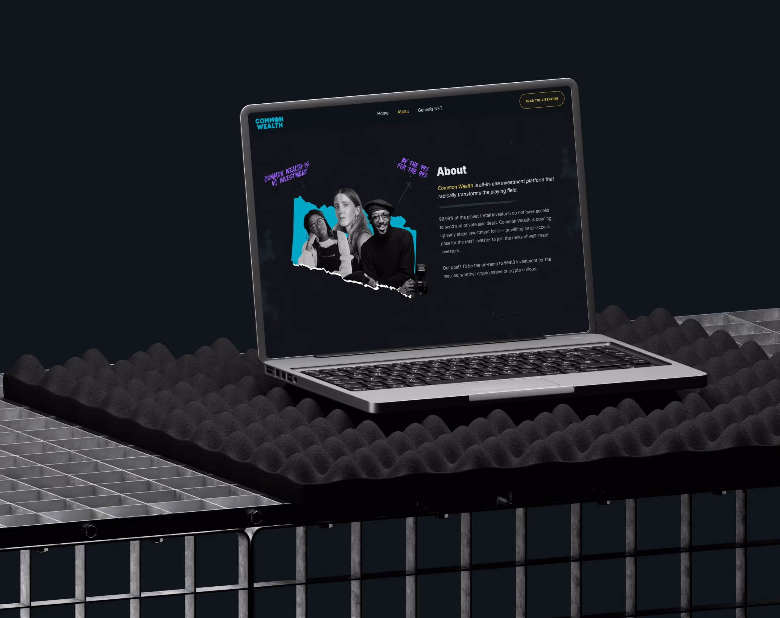 Our objective was to design a brand and website for Common Wealth that shattered conventions and embodied their rebellious spirit for the 99%. Inspired by their taglines like "Welcome to wALL Street" and "Early stage VC access for the 99%," we crafted a street-smart, instantly recognisable identity that appeals to all investor demographics.