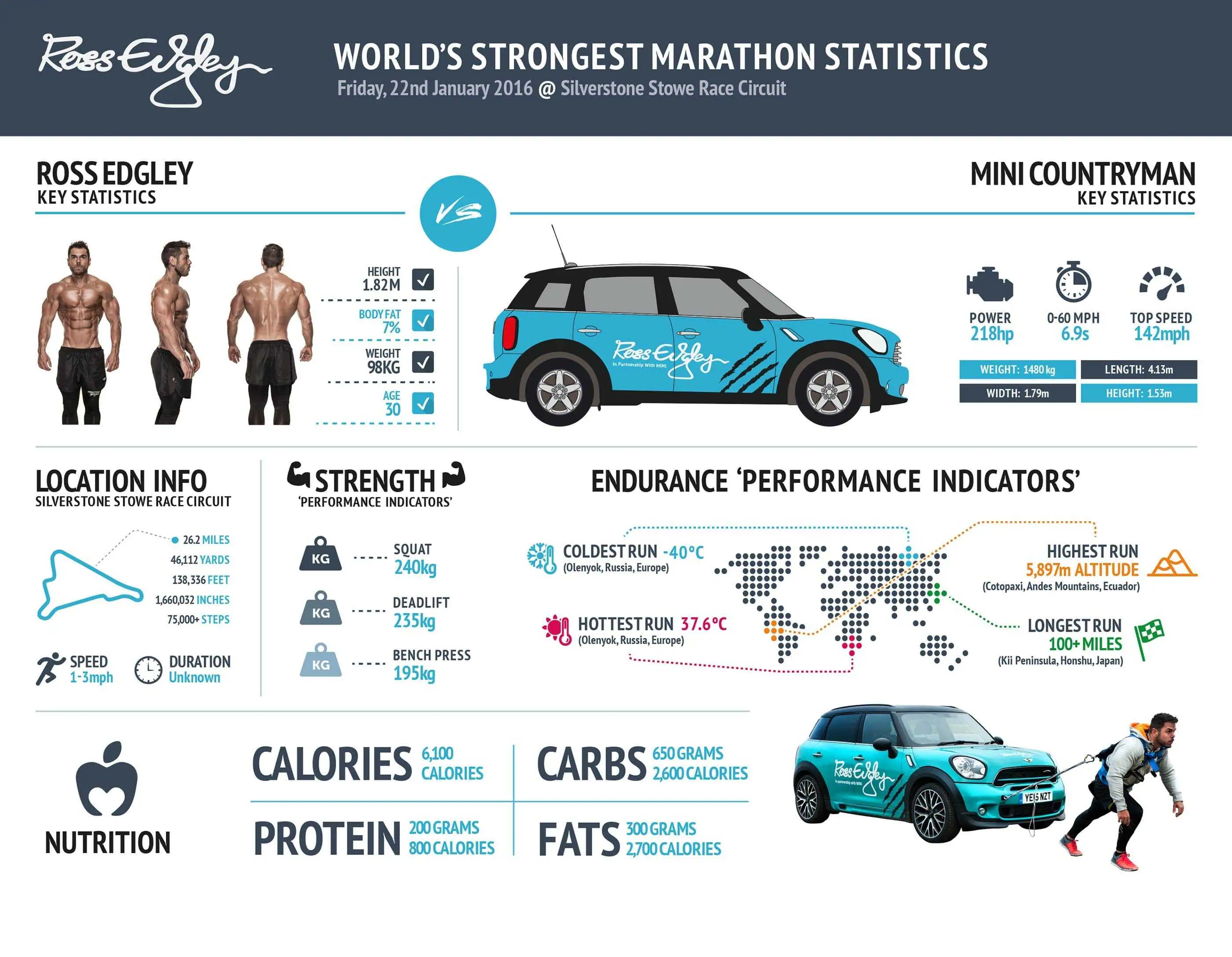 Ross trained for eight months and up to 16 hours a day for the #WorldsStrongestMarathon. It took him 19 hours, 36 minutes and 43 seconds to complete pulling the car around Silverstone Race Circuit. We worked with Ross in the lead up to the event to help create a series of promotional visuals, infographics and also designed the car wrap for the event.